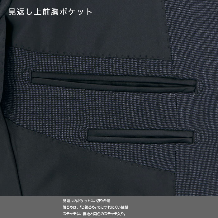 落ち着いた濃いブルーに、近くで見るとわかる繊細なマイクロチェック柄を配した、知的で洗練された印象のデザインです。無地感覚で着用でき、ビジネスシーンからフォーマルな場面まで幅広く対応できます。紺スーツよりも明るく、爽やかな印象を与えたい方におすすめです。
