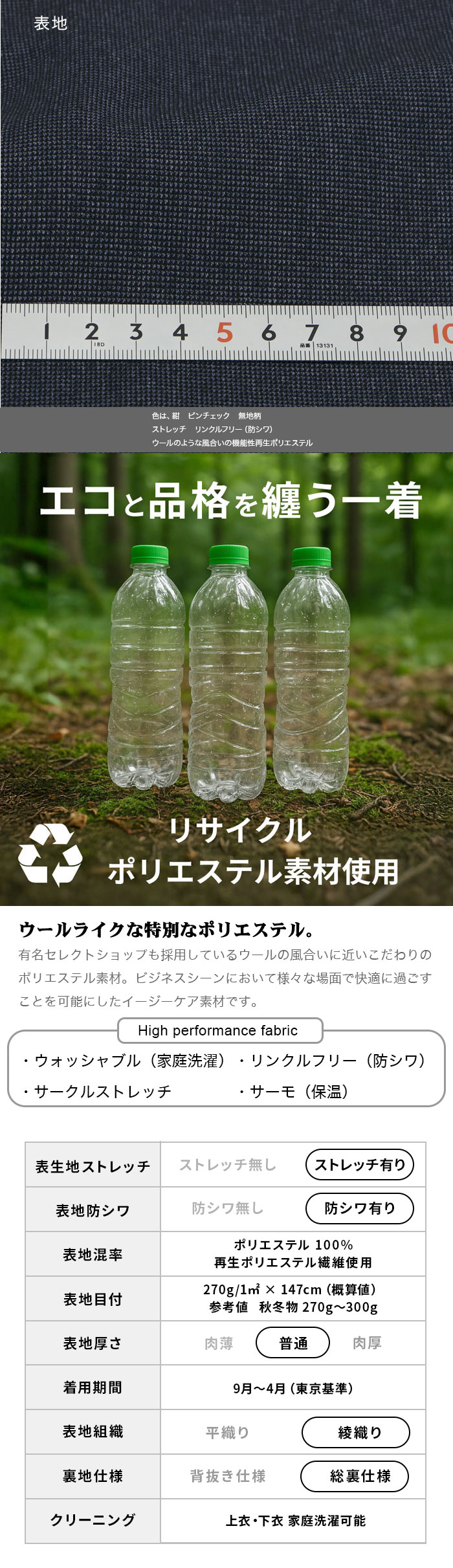 環境に配慮した再生ポリエステル繊維を使用しながら、特殊加工によりウールのような上質な風合いを実現しています。ポリエステル素材ならではの耐久性と扱いやすさに加え、ストレッチ性とリンクルフリー機能を備えた高機能素材です。