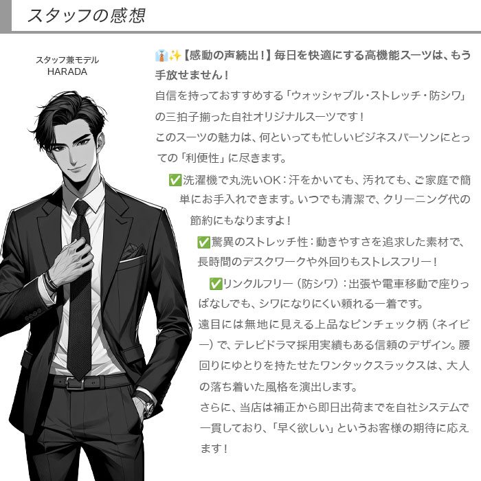 クリーニング代が節約できるウォッシャブル機能と、16,940円(税込)のお求めやすい価格で、経済的にスーツを維持できます。